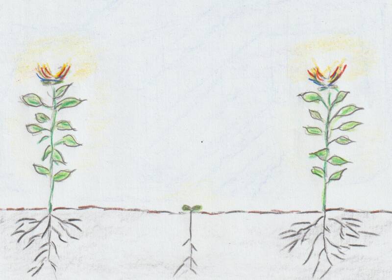 Bovenstaande beschouwing is een opmaat om tot de stelling te komen dat de plantengroei pas mogelijk is door een tweetal impulsmomenten: de bestuiving en de bevruchting. De bestuiving bovenin de plant waarbij het zaadje ontstaat met daarin opgenomen de kiem. En de bevruchting vindt plaats wanneer het zaadje in de aarde komt, samen met de andere zaadjes triljarden malen ieder jaar. We noemen het per slot van rekening ‘zaad’ en niet embryo of zoiets (3). Aan de kiemplant is nog geen spoor te bekennen van de ‘echte’ plant die later hieruit gaat voortkomen (4). Het is ook daarom dat de kiemplant zo lang lijkt stil te staan, er gebeurt daar van alles dat een gewoon groeien verre overstijgt. Het is een aankomen op aarde van een kosmische impuls. Het uitgesproken groeigebaar van dat flinterdunne kiemworteltje, recht naar beneden, zo diep als maar kan, getuigt van dat aankomstproces. Ik vind hierin ook een parallel met de verbazingwekkende lange tocht die het stuifmeelkorreltje moet maken om tot de bestuiving in de stamper te kunnen komen.