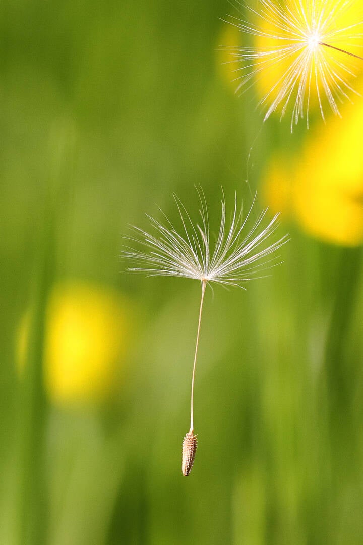 Afb. 2; een pluisje met vruchtje onderaan. In het vruchtje zit één zaadje. “Het is een soort afgezant van de hemel, die paardenbloem” (uit het hierboven genoemde citaat van Rudolf Steiner). Op deze foto lijkt alsof het net met de landing bezig is, deze hemelsbode.